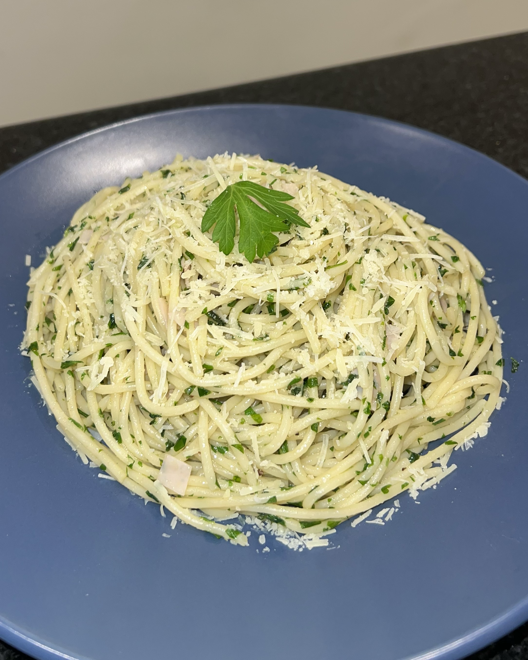 Espagueti salteado con perejil, ajo, pechuga de pavo y aceite de oliva. Una pasta ligera y aromática de semana.